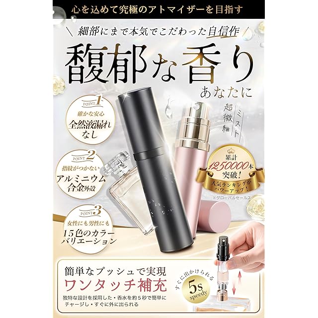 【超簡単・詰め替え方法】STEP1:香水瓶のノズルを抜きます。STEP2:本体を軽く回して、気密性を緩めた後、スムーズに引き抜きます。STEP3:本体の底をノズルにセットして押し出します。新しいアップグレードにより、直径2~3mmまたは3~5mmの直円形ノズルを持つあらゆる香水瓶を直接詰め替え可能です。特殊ホーン状や傘状のノズルにも、付属転換キャップで対応します