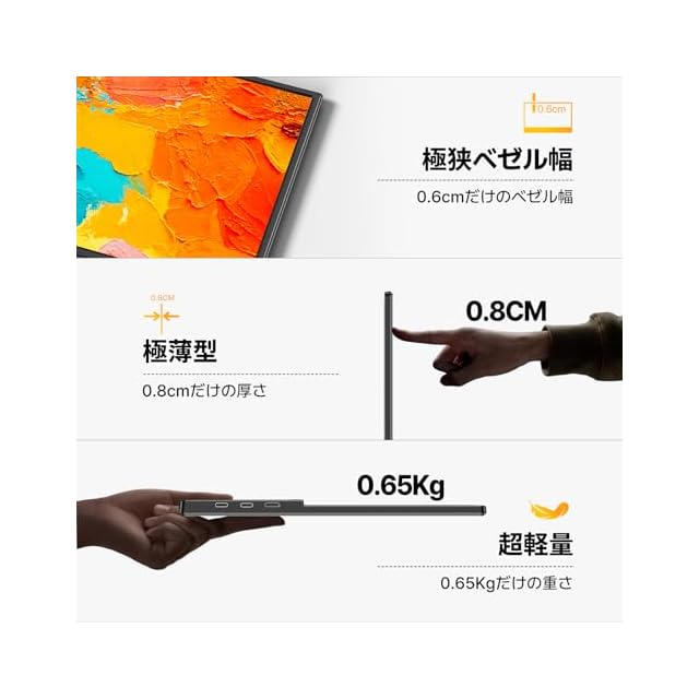 【極薄型・超軽量】 0.65Kg軽量と0.8cm薄型の外観が携帯性を展示して超薄型ベゼルにより美観が向上し、表示されるコンテンツの量が増えたため、モバイルオフィスに最適なオフィスツールです。小さい体積が簡単にバッグに収納されるので、狭いワーク環境で保管スペースを省けて生活コストを節約できます。固定場所にある従来のmobileモニターとして使用だけでなく、液晶モバイルモニターとしても使用するのは優秀です。