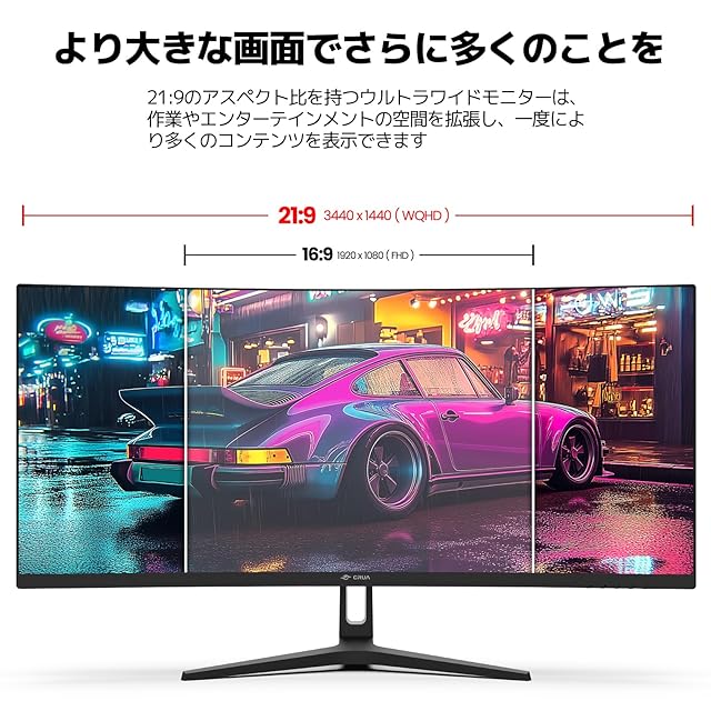 [ウルトラワイドモニター] CRUAの34インチ曲面ディスプレイは、21:9のアスペクト比と1500Rの曲率を備えており、視野を広げながら、快適なマルチタスクやさまざまなメディアでのコンテンツ制作に十分なスペースを提供します。これにより、生産性と作業効率が向上します。