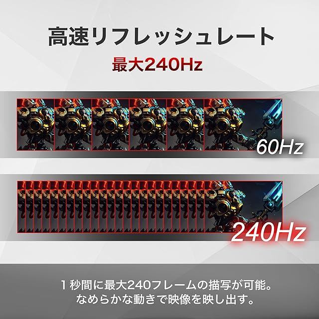 【リフレッシュレート:240Hz 】 1秒間に240フレームの描写が可能です。なめらかな動きで映像を映し出し、臨場感のあるゲームプレイが楽しめます。 ※240Hzのリフレッシュレート。実際の性能は入力機器によって異なります。