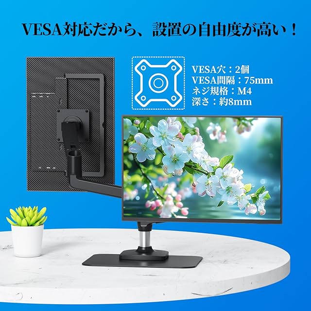 【自立スタンド付き・VESA対応・超細いベゼル!】自立スタンド付きで、0°~175°の範囲内に自由調整可能!固定力十分だから、「大角度なら倒れるかも?」って心配もなく!そのうえ、底部の滑り止めゴムは四つも!自体はもう十分安定なのに、VESAまで対応可能!安定感重視ならまさにこの品一択しかないと言えるだろう!上と左右のベゼルはわずかの4mm、周りとほぼ溶け込んでいる!下部のベゼルも10mmだけで、指一本よりもやや細い。