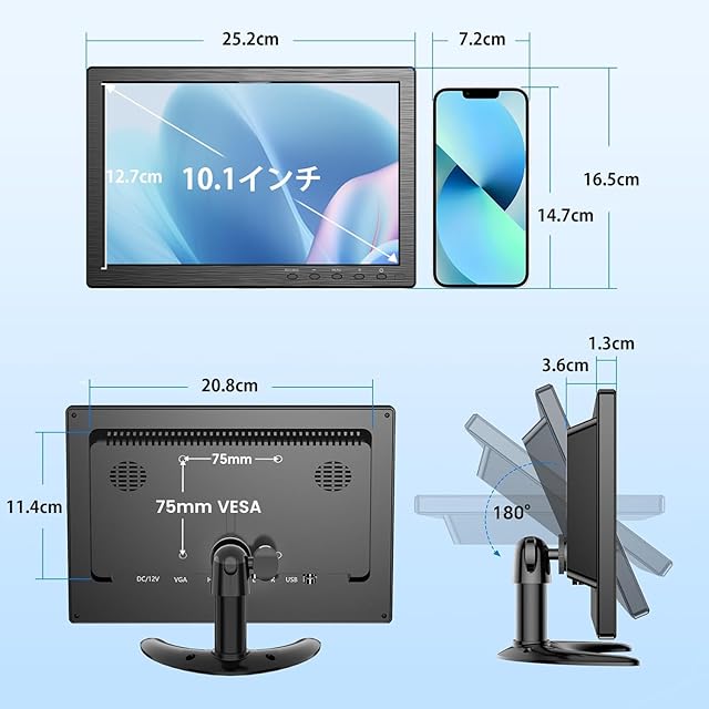 【2つのインストール方法】セキュリティモニターは2つのインストール方法をサポートしています。ブラケットを使用すると、小型モニターをデスクトップの位置に置くことができ、閉路テレビモニターや仕事のサブモニターとして使用することができます。あるいは75 mmのVESAスタンド穴を通じて壁掛けVESAスタンド(含まない)を使用して、モニターを壁や他の取り付けたい位置に簡単に取り付けることができます。机のスペースを節約するだけでなく、すべてをシンプルかつスマートに見せます。