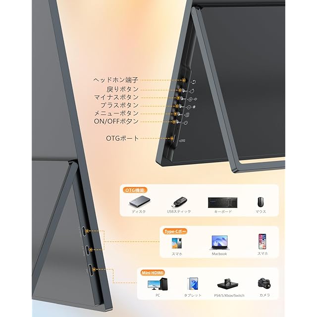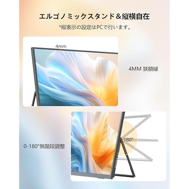 【多種モード対応·品質保証】 使用シーンによりモード選択できます。PC画面共有(拡張モード)、補足画面(複製モード)、資料確認(縦表示)など様々なシーンで適用します。また、本体にはスピーカーが内蔵されているため、音声出力も可能で映画なども楽しめるのが魅力です。電気用品安全法で規制される技術基準に適合することが認証ずみの上、本製品をご購入頂いた時点から最大2年保証を提供します。日本語説明書も付き、ご使用中に何か問題がございましたらお気軽にご連絡ください。