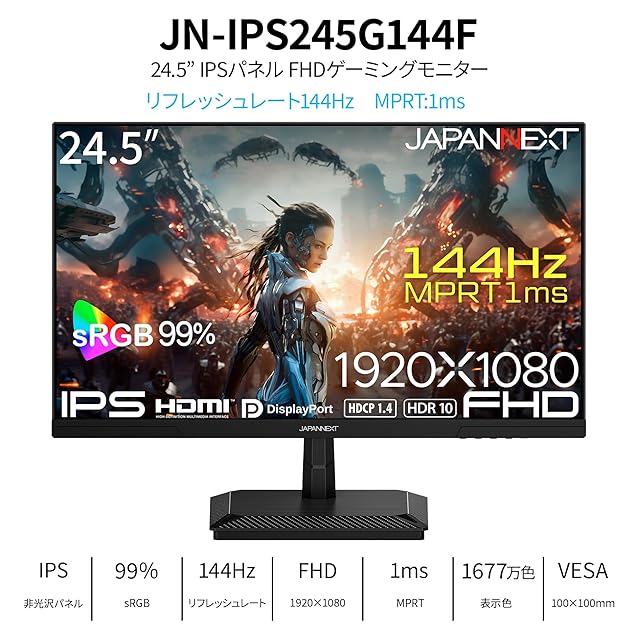 【2年保証モデル】 JAPANNEXT 24.5インチ ゲーミングモニター 144Hz 1ms FHD 1080p 1920x1080解像度 IPS パネル ディスプレイ (HDMI/DisplayPort/VESA対応/ブルーライトカット / 視野角178°) JN-IPS245G144F