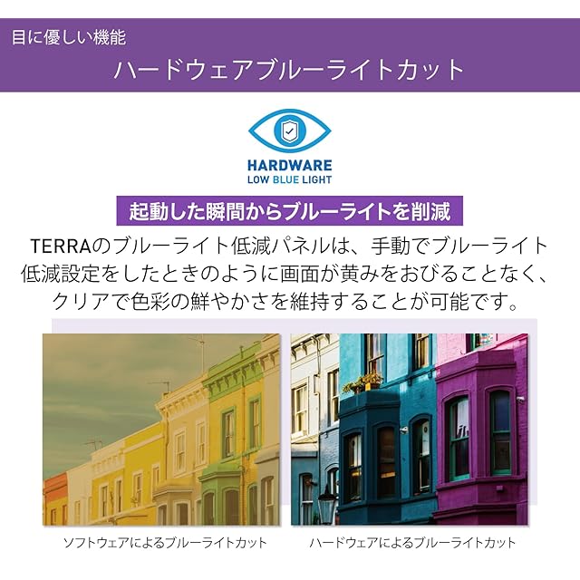 【目に優しい設計】光の反射によるギラつきがない非光沢パネル、美しい発色を維持できるハードウェアブルーライトカット、フリッカーフリー機能を搭載。目に与える負担が少ないので作業や、動画視聴、ゲームなど長時間の使用にもおすすめです。