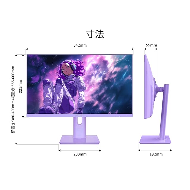 23.8インチのIPSパネルを搭載し、200Hzの高速リフレッシュレートに対応したフルHD(1920x1080)解像度のゲーミングモニターです。本体カラーにはパープルを採用。モニターベゼルやスタンドもそれぞれ本体と同じカラーで統一されており、おしゃれな空間を演出したい方や、デバイスのカラーを揃えたい方にも最適です。さらに、付属のケーブルと電源アダプターにはホワイトを採用。個性的な本体カラーの魅力を引き立てながら、自然に調和します。