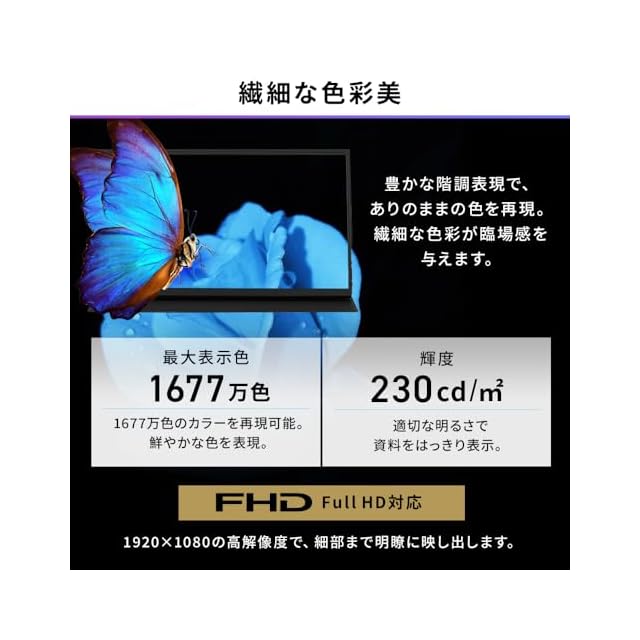 “15.6インチ”の大きな画面で細かい文字が見やすく、テレビ会議や在宅ワーク、セカンドディスプレイとしておすすめです。細部も明瞭で繊細な色彩美を再現する“FHD(Full HD)対応”1920×1080の高解像度です。