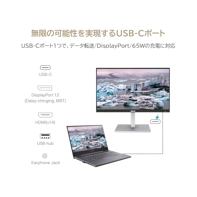 〔端子〕DisplayPort 1.2 x 1,HDMI(v1.4) x 1,USB-C x 1,(USB-C 給電 65W),DisplayPort v1.2 x1 (Daisy chain),USB 3.2 Gen 1 Type-A x4,3.5mmステレオミニジャック