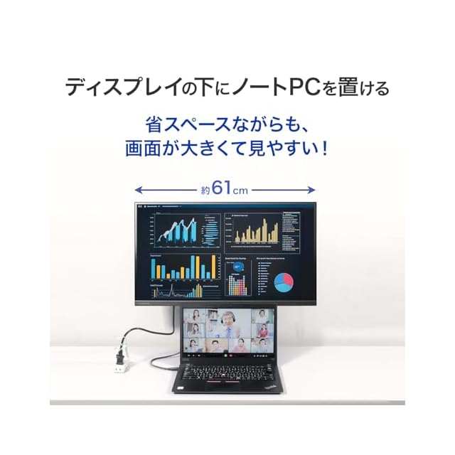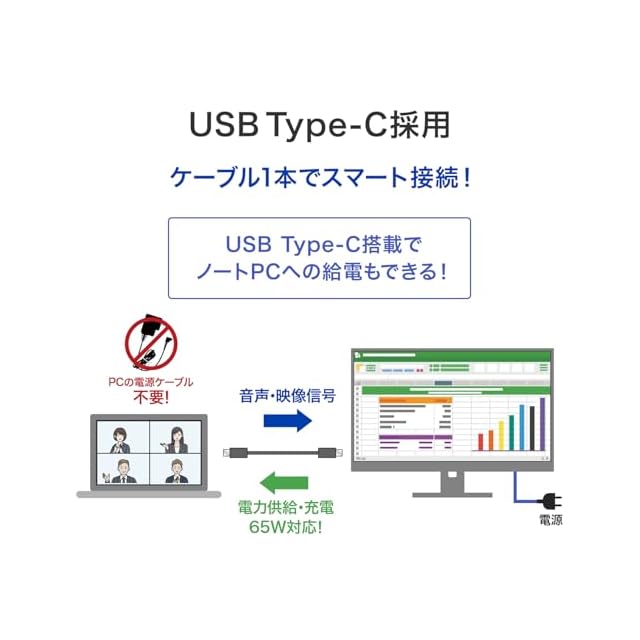 【USB Type-C採用、ケーブル1本でスマート接続!】ノートPCをUSB Type-Cケーブルで接続することにより、映像や音声の入力、ノートPCへの給電および充電がケーブル1本で行われ、使用するコンセントも最小限に抑えられます。打ち合わせはもちろん、出張や外出時もケーブル1本抜くだけでノートPCをすぐ持ち出せます。