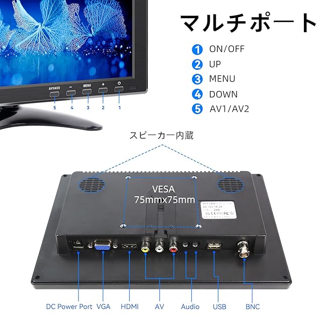 Thinlerain 10.1インチモニター 小型 ディスプレイ 液晶ディスプレイ モニター/HDMI VGA AV BNC USB ポート/1920x1200/16:10/178°視野/VESAマウント/スピーカー内蔵/リモコン