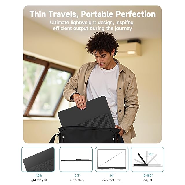 【軽量で便利・折りたたみ式スタンド付き】最も薄い部分で約7.5mm、14インチポータブルディスプレイ本体だけで550gという軽量設計なので、出張や外回りのときなどの携帯用にもおすすめです。さらに、アルミニウム合金のCNC加工により耐久性と重量のバランスが向上しました。重くて面倒なカバースタンド不要、本体に自立式スタンドを搭載、180°縦横自由調整可能、いつでも楽々に使います。