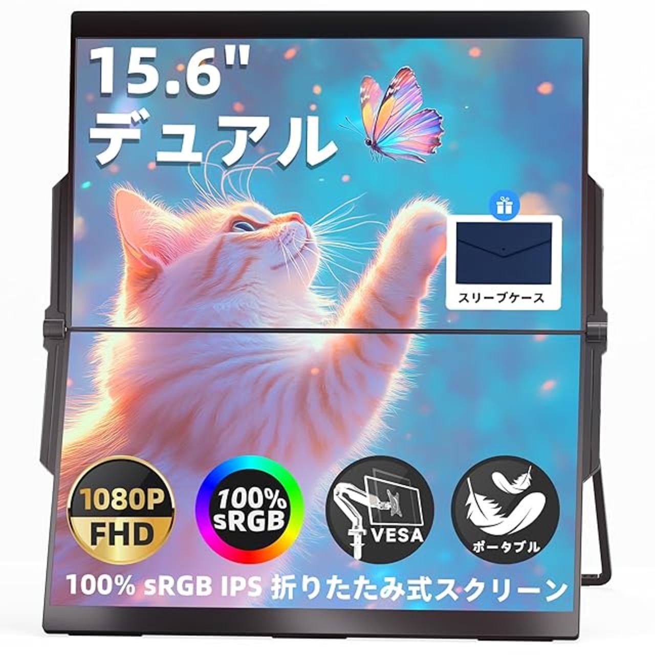 Ingnok デュアル モバイルモニター 15.6インチ モバイルモニター 2画面 デュアルディスプレイ FHD 1080p 折りたたみ式 モバイルディスプレイフル機能Type-C IPSパネル VESA対応 自立スタンド付き