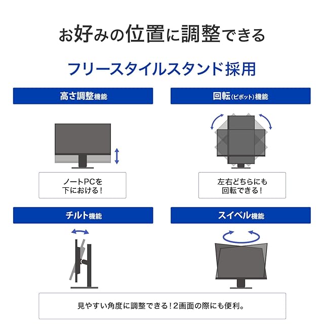 【高さや角度を調整できる!フリースタイルスタンド】高さや角度を見やすい位置に調整できるので、目や肩の疲れやストレートネック対策の1つとしても効果的です。お好みの位置に調整できる4つの機能「高さ調整機能」「回転(ピボット)機能」「チルト機能」「スイベル機能」付き。
