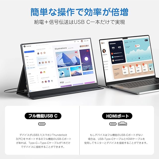 【幅広く接続に対応・ケーブル1本接続】このモバイルモニターはMini HDMI、Type-C二つが搭載されて、すべてのコンピューターと交換性があります。ほとんどのパソコン、スマホも対応できます。Nintendo Switchゲーム機、PS3、PS4、PS5、Xbox One等も簡単に繋がって、複雑な設定要らずに使用できます。何よりも便利なのは、Type-Cケーブル一本で映像出力と給電を同時に実現できます。Type C端子で接続できない端末は、HDMI接続との選択肢があります。ご注意:Type Cケーブル一本で接続する場合、接続の端末がDP ALT MODE(映像出力)に対応しなければなりません。接続端末から電源を取る場合、端末の電力低下で給電不足になることもあります。この場合、電源アダプターで給電してください。
