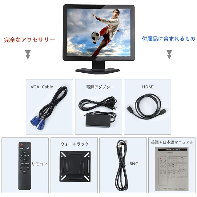 <p>17インチ 1280x1024解像度 TFT LCDモニター。画像がクリアで、精緻で、カラフルです。</p> <p>エレガントなスタンドを備える洗練されたスリムなデザインは、どんな狭いスペースにもシームレスに溶け込みます。ハンギングウォールで壁に取り付けることもできます。</p> <p>マルチインターフェース入力でHDMI、VGA、USB、AV、BNCに対応しています。</p> <p>- HDMIポート</p> <p>HDMIは優れたデジタルビデオとオーディオを提供するだけでなく、1本のケーブルだけでモニターやテレビに接続し、異なるシーンやビューを1つの画面に表示することもできます。</p> <p>- VGAポート</p> <p>VGAポートを備えるすべてのPCにこのLCDモニターを接続することができます。さまざまな入力デバイスの中から好きなものを選んで、このLCDモニターをミニPCモニターとして使用すれば、最高のアナログビデオを表示させることができます。</p> <p>- USBポート</p> <p>USBスティックやMP5に接続することで、映画のUSBマルチメディア再生に対応します。また、スマートフォンを充電することもできます。</p> <p>- AVポート</p> <p>AVポートを備えるDVD/VCD/TV BOXに接続できます。</p> <p>- BNCポート</p> <p>プロレベルのセキュリティを備えるBNC信号入力。特に注意を払う必要がある場所をリアルタイムで監視する、プロレベルのセキュリティ監視装置の接続に使用されます。</p> <p>さまざまな信号間の相互干渉を低減し、最適な結果を実現します。</p> <p>仕様:</p> <p>画面サイズ:17インチ TFT-CCTV</p> <p>表示域:17インチ 4:3 LCDデジタルスクリーン</p> <p>最適解像度:1280x1024</p> <p>信号入力:HDMI、AV、VGA、BNC、USB</p> <p>操作モード:キー操作およびリモートコントロール</p> <p>輝度:450 cd/m²</p> <p>コントラスト:500:1</p> <p>視野角:175°</p> <p>スピーカー:内蔵スピーカー</p> <p>入力:AC 100~240V、50~60Hz(世界中の電圧)</p> <p>出力:DC 12V、2A</p> <p>パッケージ内容:</p> <p>17インチ TFTカラーLCDモニター x1</p> <p>電源アダプター x1</p> <p>VGAケーブル x1</p> <p>BNCケーブル x1</p> <p>HDMIケーブル x1</p> <p>壁掛け用ブランケット x1</p> <p>デスクスタンド x1</p> <p>リモコン x 1</p> <p>取扱説明書 x 1</p>