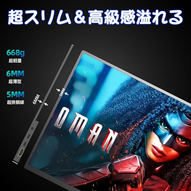 【16インチ大画面・ベゼルレスデザイン】16インチのモニターですが、筐体全体ともアルミ合金製なのに、本体重量はなんと約668gに過ぎず、品質と重量のバランスが良く取れています!モバイルモニター上と左右のベゼルはわずかの5mm、画面占有率は実に約90%とほぼフレームレスを実現している!携帯性と機能性に優れており、外出時は鞄に簡単に収納できます。ご注意:製品の表面には保護フィルムが貼ってありますので、剥がしてご使用ください。