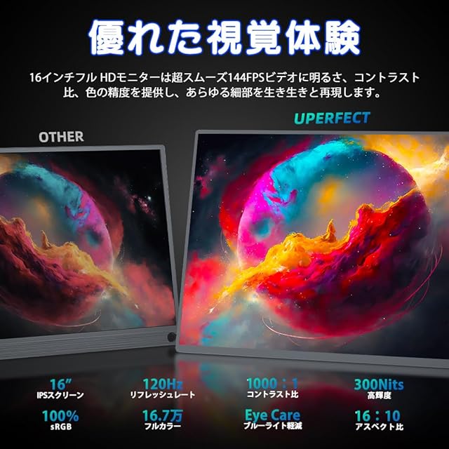 【非光沢IPS液晶パネル&美しい映像体験】UPERFECTモバイルモニターは画質・発色が共に高品質なIPSパネルを採用し、視野角による輝度変化が少なく、最大178°までの超広角を実現し、どこから見ても鮮明な画像や映像が表示できます。 1000:1 の高コントラスト比で、低階調や明暗の混在したシーンにおける細やかな表現まで忠実に映し出すことができます。輝度は350cd/㎡を達し、画面がより明るくはっきりと映ります。sRGBカバー率100%を達成した広色域かつ高い色再現性により、デジタルカメラで撮った高解像度の写真や動画までも、鮮明に高画質でお楽しみいただけます。