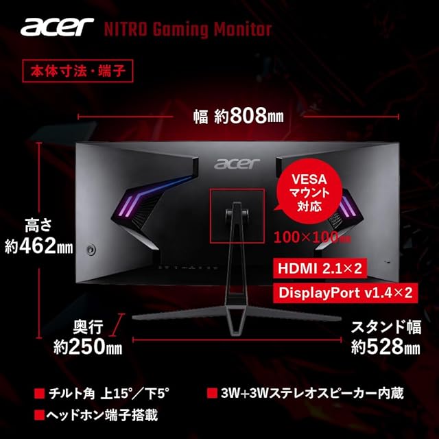 Acer Nitro 湾曲 ゲーミングモニター 34インチ UWQHD (3440 x 1440) VA 非光沢 240Hz 0.5ms Adobe RGB 90% AdaptiveSync HDR10 HDMI 2.1 DisplayPort 1.4 ヘッドホン端子 ED343CURXbmiippx