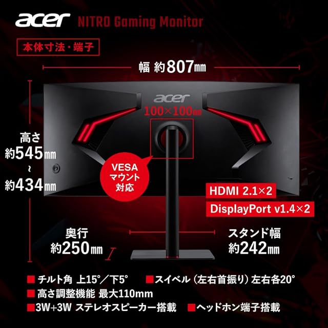 Acer Nitro 湾曲 ゲーミングモニター 34インチ ウルトラワイド 非光沢 広視野角VA 240Hz 0.5ms(GTG) AMD FreeSync Premium HDR10 Adobe RGB 90% ブルーライトシールドプロ HDMI 2.1 DisplayPort v1.4 スピーカー・ヘッドフォン端子 VESAマウント対応 XV345CURXbmiipphx