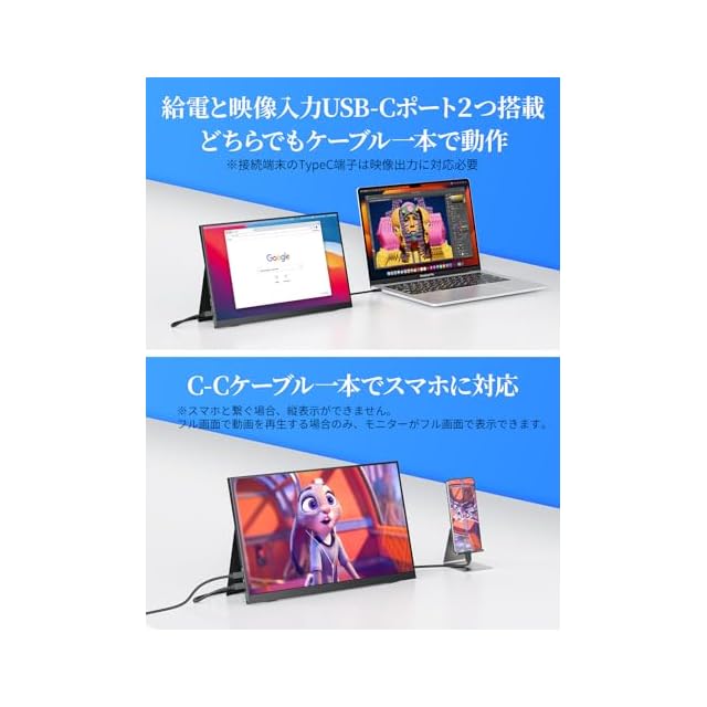 【USB-C1本で接続】*接続端末のTYPE C端子は映像出力に対応必要!ご使用の端末がDP Alt modeに対応していれば、付属のC to Cケーブルで接続すると、モニターへ映像・音声・給電がケーブル1本で行われます。【ご注意:直接に接続の端末から電源を取る場合、端末の電力低下で、給電不足によるちらつきや表示不安定が発生する可能性があります。この場合、アダプターで給電してください。】更に、付属のUSBアダプタと電源用ケーブルを使い、モニターに電源供給を行えば、モニターを使用しながらType-C経由で接続しているPC・スマホなどの端末への給電も行われます。電圧を安定させ、輝度、音量を上げるとしたら、付属の電源アダプターを使用して電力を供給してください。【ご注意:USB A-USB Cケーブルは給電ケーブルで、映像転送できません。映像転送できるのは付属のTYPE-C to TYPE-Cケーブルです。】