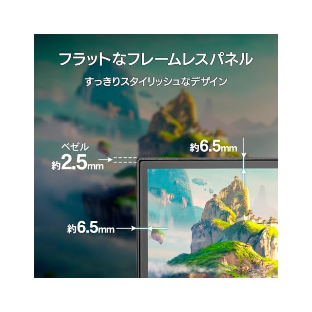 【フレームによる段差がない、フラットなフレームレスモデル】パネルとフレーム(枠)による段差がないフラットなフレームレスパネルを採用しました。わずか約2mmの極細フレームですっきりした印象を与え、オフィスにも自室にもマッチします。フレームが気にならないので、マルチディスプレイにもオススメです。