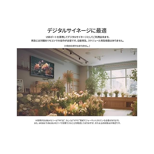 31.5インチのVAパネルを搭載、FWXGA(1366 x 768)解像度に対応した液晶モニターです。USBメモリーからのコンテンツ再生に対応、手軽にデジタルサイネージを導入することが可能です。