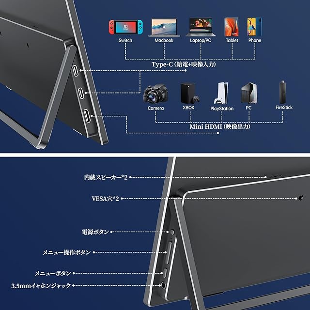 【ケーブル一本だけで接続可能】miniHDMI、Type-C二つ、3.5mmイヤホン、豊富な入力端子をもって多様な接続方法を実現。何よりも便利なのは、Type-Cケーブル一本で映像出力と給電を同時に実現できます、しかも二つのType-C端子とも信号転送+給電両対応。Type C端子で接続できない端末は、HDMI接続との選択肢があります。両端子とも対応している端末なら自由に接続できます。