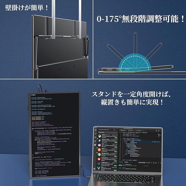 【自立スタンド付き・VESA対応】自立スタンド付きで、0°~175°の範囲内に自由調整可能!固定力十分だから、「大角度なら倒れるかも?」って心配もなく!そのうえ、底部の滑り止めゴムは四つも!自体はもう十分安定なのに、VESAまで対応可能!安定感重視ならまさにこの品一択しかないと言えるだろう!