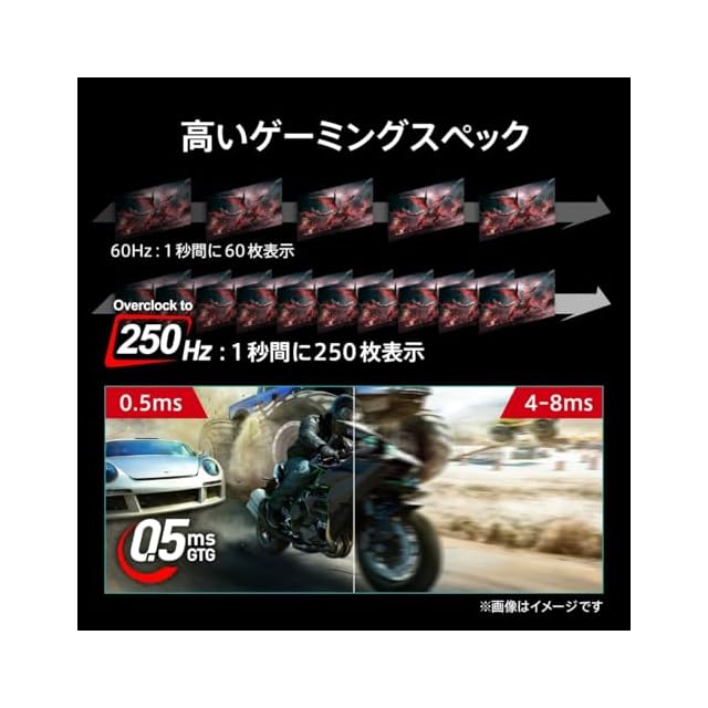 ●最大リフレッシュレート:240Hz(オーバークロック設定時:250Hz)●応答速度:0.5ms(GTG、最小値)●パネル駆動方式:RAPID VA●表面タイプ:ノングレア