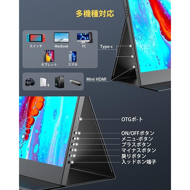 【一本だけで接続・多機種に対応】miniHDMI、Type-C二つ、3.5mmイヤホン、豊富な入力端子をもって多様な接続方法を実現。何よりも便利なのは「面倒な設定一切不要」、Type-Cケーブル一本で映像出力と給電を同時に実現できます、しかも二つのType-C端子とも信号転送+給電両対応。TypeC端子で接続できない端末は、HDMI接続との選択肢があります。『Nintendo Switch』野外プレイ|『MacBook』サブディスプレイ|『PS5』戦闘画面を自由切替、両端子とも対応している端末なら自由に接続できます。ノードパソコン、デスクトップ、スマホ、PS4/PS5、XBOX ONE、Wii又はNintendo Switch、Raspberrypiなど多機種に対応しています。ドライバー要らずにすぐ使用でき、60Hzの高速応答も可能なので、FPSゲームやアクション映画など動きの速いコンテンツを楽しめます。