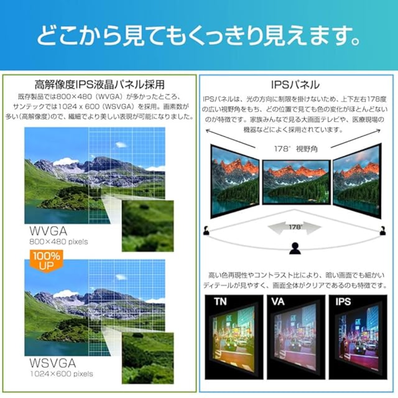 【IPS液晶パネル採用】 上下左右178度の広視野角で、どの角度から見ても色の変化が少なく、鮮やかで高精細な映像を楽しむことができます。