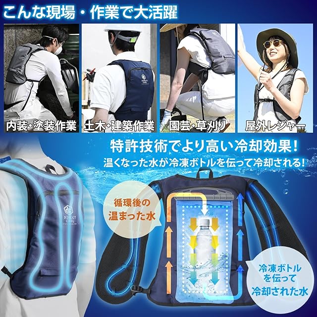【仕様】容量650mlまでのペットボトルに対応。ペットボトル1本で、冷たさ持続最大約1時間30分から最大2時間。※当社調べ(使用環境36度 湿度70% チューブ表面温度26度以下の時間)※使用環境や体温により異なります。使用する水はたったの150ml(冷水がオススメ)。ペットボトルを交換すれば冷たさが復活。市販のモバイルバッテリーでも使用可能に(5V2.0-3.0A)※相性の問題で一部使用不可能な可能性もございます。バッテリーは前面収納で操作もしやすく、電源はON/OFFの簡単切替えです。
