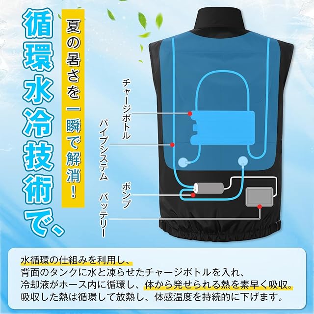 【高効率水循環技術&省エネ】この冷却ベストは、最新の水循環技術を採用しています。内蔵されたポンプが効率よく動作し、チューブ内に冷たい水を循環させることで、体から発せられる熱を素早く吸収し、すぐに体感温度を下げることが可能です。服には400mlの大容量チャージボトルが搭載されており、繰り返し使用可能です。使い捨て冷却材による資源の浪費や環境への負荷を避け、エネルギー効率に優れた環境配慮型設計です。