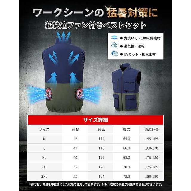 【男女兼用・熱中症対策必需品】サイズはM~3Lまでと幅広く展開されているので男女関わらずご着用頂けます。取り付け、取り外しも簡単で、ファンを取り外してウェアを洗うことができるので気軽に楽しむことができます。(※洗濯前に必ずバッテリー、ファン、ケーブルを取り外してください。)蒸し暑さを瞬時に吹き飛ばし、圧倒的な冷感を得られます!360°全面強力送風、3秒だけかかり体温が瞬間に-16℃下がり、瞬間冷却を実現しました。エアコンが使用できない状況での作業者のための熱中症対策商品。工場・林業・農業・建築作業・溶接作業などの高温環境に対応して一気に涼しくなります。KLIFE空調ベストを着用して、高温環境でも「リラックス」して作業ができ、効率を向上させます。