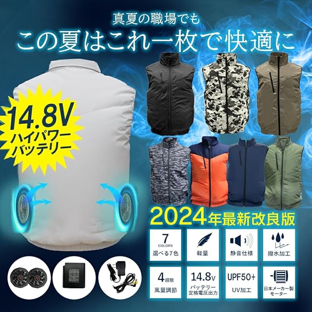 【空調ベストで暑~い夏も快適!】ベストの左右の腰の辺りに取り付けた2基のファンが高速で回転することにより、大量の風をベストの内部に取り込み、体の周りの熱を逃がし続け汗の気化を促進し、温度、湿度ともに快適にしてくれる空調ベストです。ゴルフ、釣り、キャンプ、工場や作業と様々なシーンでご使用いただけます。