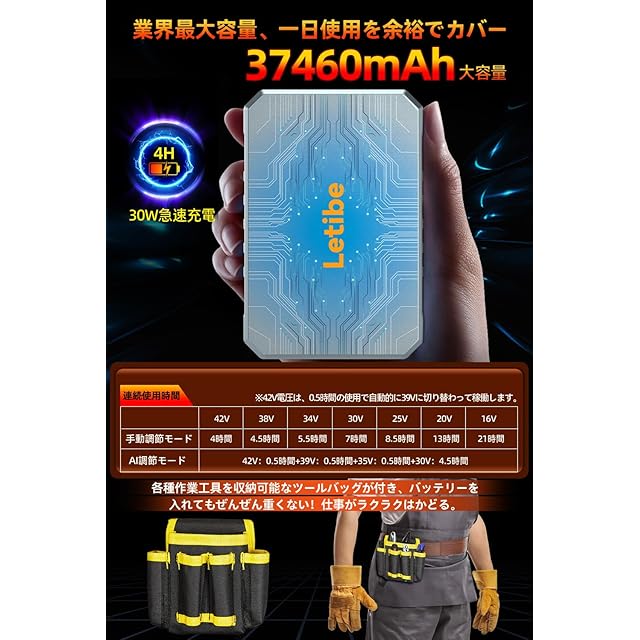 【次世代デュアルモードバッテリー 36,000mAh/42V|プロ仕様の高出力&長時間駆動を両立】業界最大級の16V~42V広域電圧を、手動7段階調節モード(42V→16V→20V→25V→30V→34V→38V)とAI自動最適化モード(42V→39V→35V→30V)で自在に制御。精密作業では繊細な電力調整を、重作業では瞬発力をAIが自動判断し、プロユースに最適な「パワー」と「持続力」を兼ね備えました。30Wスーパーチャージャー搭載で超大容量36,000mAh(※3.85V高密度設計/3.7V換算37,460mAh相当)をわずか4時間充電で最大20時間連続使用可能。工具から精密機器まで、あらゆる現場の電力課題を解決する次世代作業ウェア専用バッテリーです。