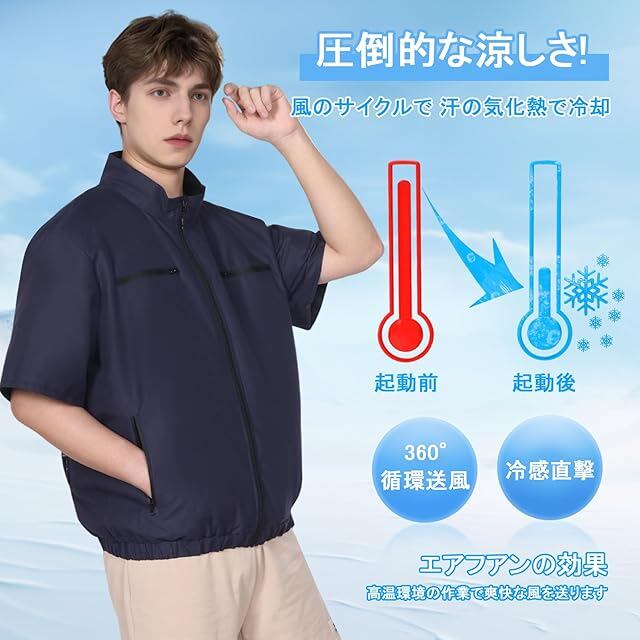 [Joyesplay] 空調作業服 ファン付き作業着 空調服 半袖 空調冷却服 最新 ファン付きウェア 空調作業服 3段階風量調節 大風量 暴風ファン 循環送風 熱中症防止 通気 速乾 夏 暑さ対策 男女兼用 (JP, アルファベット, XL, ネイビー)