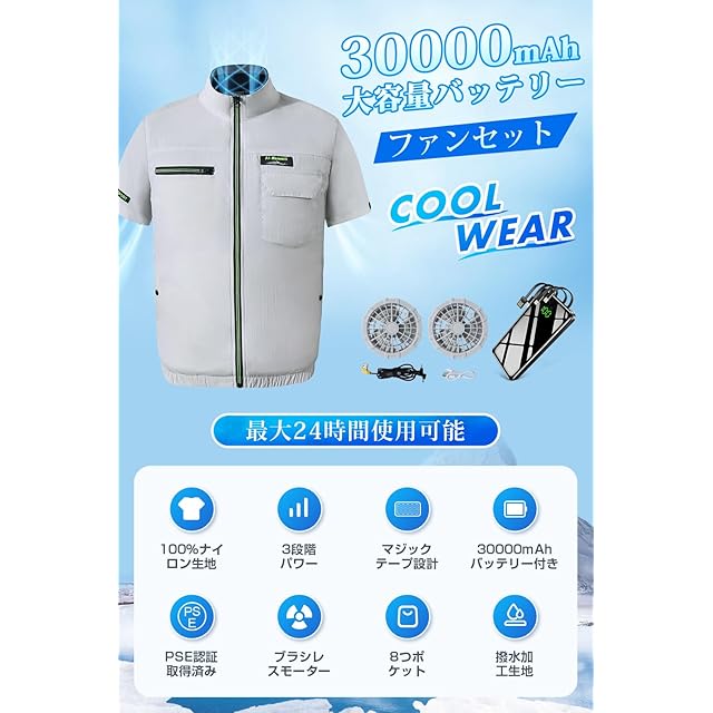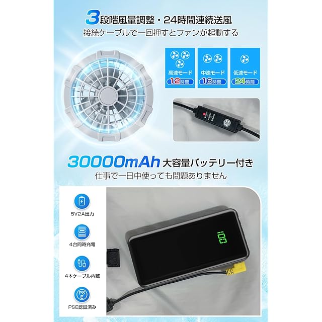 【30000mAh(111wh)大容量バッテリー付き&超時間稼働 】空調作業服ファンバッテリーセットで、30000mAh(111wh)の大容量モバイルバッテリーが装備されており、最大で24時間の使用が可能です。モバイルバッテリーがPSE認証済みで、長期間安心してお使いいただけます。(洗濯する際には必ず空調作業服のファンセットやバッテリーを取り外すようにしてください。)