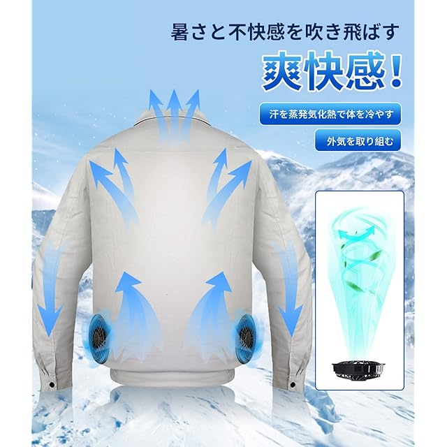 【通気性抜群&循環送風】生地の微細孔は通気性があり、左右の腰の辺りに取り付けられたファンを用い、衣服の中に外気を取り入れ、体の表面に大量の風を流すことにより汗を蒸発させ、体を瞬時に冷やし、全身を清涼感で包みます。炎天下の作業で涼しい服の使用範囲は非常に広く、高温の悪境、建築労働者、室内作業、屋外作業及び屋外探検など多くの場面で使用でき、暑さ対策と夏場の作業効率を上げられます。