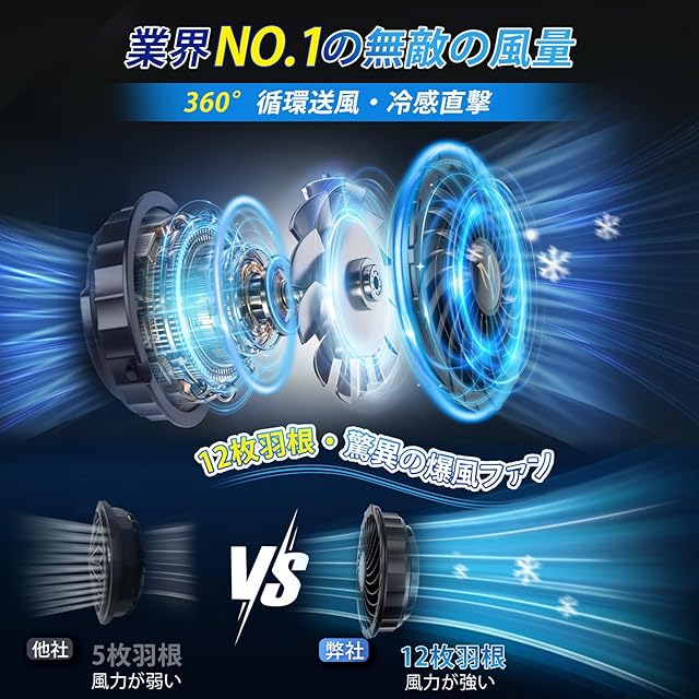 【業界NO.1無敵の風量・12枚羽根・驚異の爆風ファン・6段階風量調節】空調作業ジャケット服ベストは日本製高効率ブラシレスモーターと12枚羽根ファンを設計により、5枚羽根の空調ファンのモーターより、回転スピードが2.5倍以上高い、低騒音で風量UP!風が強力でまっすぐ強い風を吹かせます。圧倒的な省エネ性能があり、直進性の高い風量を作り出せ、普通型の空調ファンより平均18℃温度を下げる効果を実現しました。6段階に風量を調節でき、使用シーンに合わせて涼しさを調整できます。スイッチを入れると瞬時に空調ウェアが膨張し、腹部から背中まで一瞬のうちに風が巡り、首元まで風が巡って気持ちいい! 夏の猛暑を忘れてしまうほどの快適な涼しさを得られます。