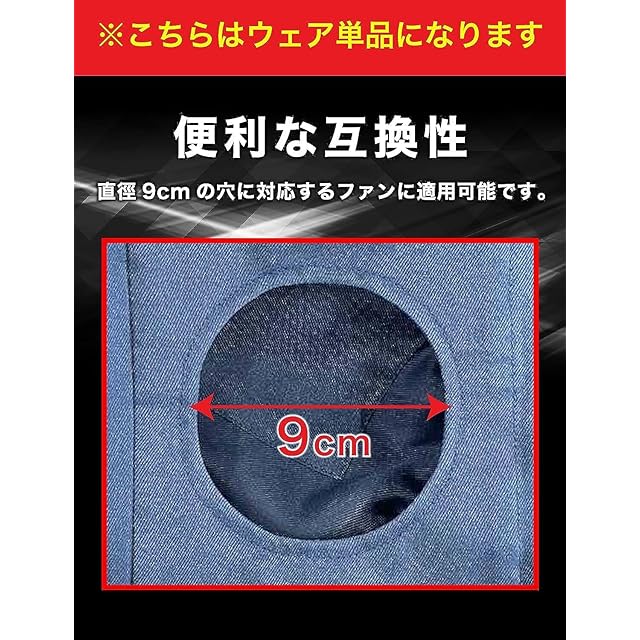 【9cmファン対応+立体襟構造|既存機器と互換性あり】 背面には直径9cmの空調ファンに対応したファンホールを搭載しており、すでにお使いのファン・バッテリーとそのまま接続可能です。別途機器を買い直すことなく、コストを抑えて使いまわしができます。 さらに、襟部分には形状保持ワイヤーを内蔵しており、襟を立てて風の流れをコントロールできる設計。首元への風の通りを確保しやすく、蒸れの軽減と冷却効率の向上に貢献します。