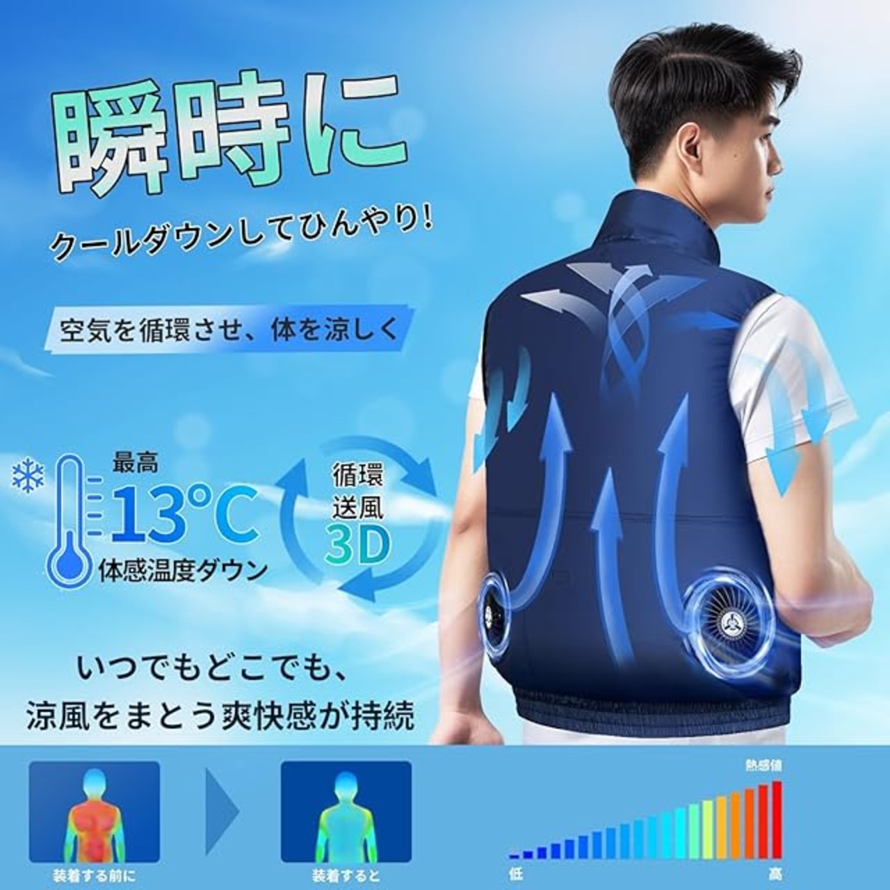 【夏に欠かせないアイテム】最新改良版ファン付き作業服は日本製9枚羽根ファンを採用しており、しっかりとした風量を確保しながらも静かな動作を実現します。効率的に空気を循環させ、瞬時に体感温度を下げます。炎天下でも極上の涼しさを実現し、作業効率の向上と熱中症の予防になります。