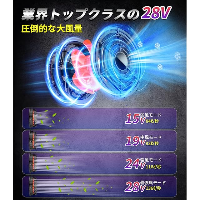 【驚異の136L/S爆風&4段階風量調節】2025年新型ハイパワーファン空調ベスト登場します。上質な高密度ABS素材、高性能全銅芯ブラシレスモーターを採用し、圧倒的な省エネ性能を実現しています、回転音が気にならない静音設計です。空調ウェアの付属のファンは最多の5枚羽タイプを使用。風力がパワフルなのに静音でストレスフリーの心地良い風を生み出します。スイッチを入れると瞬時に空調ウェアが膨張し、腹部から背中まで一瞬のうちに風が巡り、首元まで風が巡って気持ちいい! 夏の猛暑を忘れてしまうほどの快適な涼しさを得られます。28V高出力リチウムオンバッテリーと組み合わせることによって、「最強風ー強風ー中風ー弱風」4段階の風力が調節でき、炎天下での作業時に体感温度を最適化にすることで、実用性と便利性を兼ね備えたアイテムです。