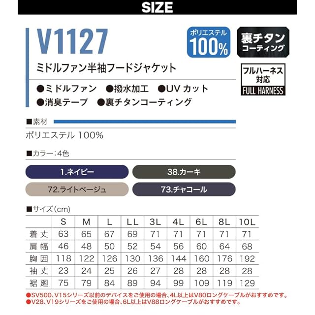 村上被服 ミドルファン半袖フードジャケット(単品) V1127 ※ファンバッテリー別売り※うきしろちゃんこはぜストラップ付き<br /><br />通常ファン位置より高いミドルファン(ハイバック・上部ファン)位置にファンを<br />取り付けることで、背中から体全体に風が吹き抜け、より強い風が首元から抜けます。<br /><br />※SV500またはV15シリーズ以前のデバイスを使用する場合:<br />4L以上はロングケーブルV80推奨<br />※V28シリーズまたはV19シリーズを使用する場合:6L以上はロングケーブルV88推奨<br /><br />■素材<br />ポリエステル 100%<br /><br />■機能<br />フルハーネス対応 ミドルファン<br />撥水加工 UVカット<br />消臭テープ 裏チタンコーティング<br />ロゴ入りフロントファスナー<br />左胸二重ポケット フードストレッチパイピン<br />2丁掛け対応フック掛け<br />フードゴムスピンドルストッパー<br />耳部分面冷感コンプレッション<br />首元ダクト ランヤード取り出し口<br />左胸プリントファスナー フード取り外し可能<br />カフス釦 ケーブル止め(ドットボタンタイプ)<br />袖ペン差し 左右胸ポケットコード通し穴<br />ファスナー付きバッテリーポケット