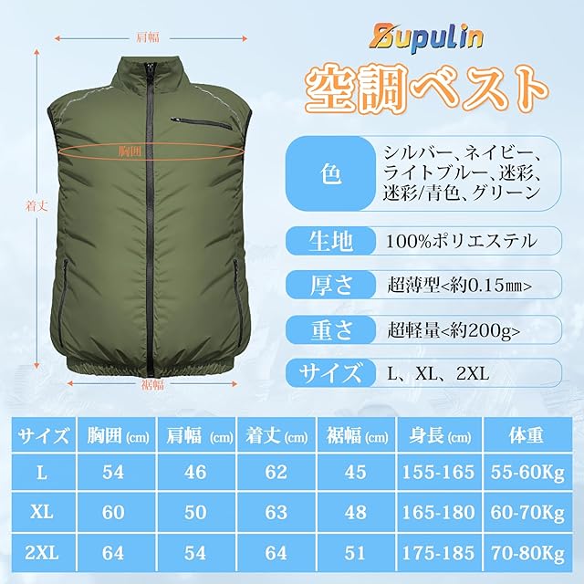 <br><b>✿✿✿✿✿✿✿✿✿✿Supulinへようこそ✿✿✿✿✿✿✿✿✿✿</b> <br> <br><b>【仕様詳細】</b> <br>空調作業ふくのサイズ:L、XL、2XL(男女兼用) <br>素材:ポリエステル 【ご注意】</b> <br>①市販の直径約9CMのファンに適用します。 <br>②ファンは含まない、服単品です。 <br><b>【高質量な空調ウェア単品】</b> <br>✿【吸汗速乾素材】優れたポリエステル素材を採用し、肌触りよく、通気性も抜群、汗をすぐに吸収して乾かし、肌にべとつきにくくし、吸汗速乾の空調作業着です。 <br>✿【UVカット効能】UVカット率は95%以上で日焼け対策にも最適で、着るだけですぐにお肌を紫外線から守ってくれます。 <br>✿【洗濯機も洗える】ベストが汚れて洗い替えに必要な場合、予備用としてお使いいただけます。洗濯機洗いも手洗いも可能です。 <br>✿【高品質な留め具】空調作業服のみに付いている高品質なファスナーですが、脱着便利になります。クーラーのファスナーは上質な金属を採用しているので、錆びにくく、スムーズな上下引きことができ、滑りが悪くなる事を心配することはありません。 <br>✿【様々なシーンで大活躍】猛暑の夏に、普通の工事現場、農作業、運送業などの作業着としてはもちろん、工場や暑い夏の屋外作業など高温環境下でも快適に作業ができ、作業効率がアップします。 <br>✿【1年間品質保証】弊店からご購入日より1年間以内であれば、製品に不具合が生じた場合は、いつでも、メールにてご連絡ください、必ず早めにご対応いたします。必ず最善を尽くし、保証サービスをご対応いたします。
