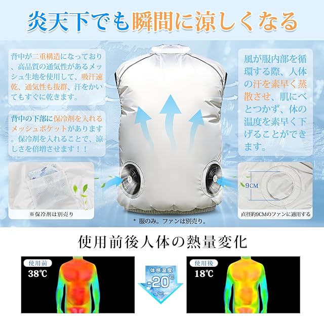 ❆【仕様詳細と品質保証】空調作業ふくのサイズ:L、XL、2XL(男女兼用) 素材:ポリエステル ご注意:①市販の直径約9CMのファンに適用します。②ファンは含まない、服単品です。弊店からご購入日より1年間以内であれば、製品に不具合が生じた場合は、いつでも、メールにてご連絡ください、必ず早めにご対応いたします。必ず最善を尽くし、保証サービスをご対応いたします。
