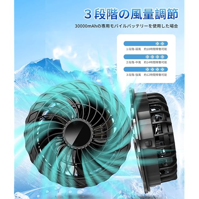 【大容量バッテリー付き&長時間稼働】30000mAh大容量バッテリーが付いており、風量モードにより使用時間は約12‐18時間になり、長時間稼働する ことが実現できます。また、USB給電なので、専用バッテリーだけでなく、モバイルバッテリーも使用可能です。なお、モバイルバッテリーには5V/2.2A安定 な出力を持ち、空調作業服用だけでなく、スマホなどの電子製品への充電にも適用します。更に、PSE認証を取得済で、心置きなくご利用頂けます。