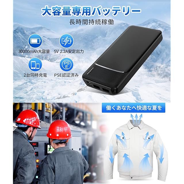 【大容量バッテリー付き&長時間稼働】30000mAh大容量バッテリーが付いており、風量モードにより使用時間は約12‐18時間になり、長時間稼働する ことが実現できます。また、USB給電なので、専用バッテリーだけでなく、モバイルバッテリーも使用可能です。なお、モバイルバッテリーには5V/2.2A安定 な出力を持ち、空調作業服用だけでなく、スマホなどの電子製品への充電にも適用します。更に、PSE認証を取得済で、心置きなくご利用頂けます。