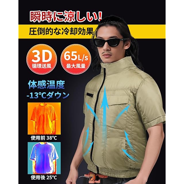 [Sumeriy] 空調作業服 半袖 ファンバッテリーセット 超高出力 【30000mAh大容量バッテリー付属】 ファン付き作業服 4段階風量調節 超長連続使用時間 軽量 薄型 吸汗速乾 UVカット 静音 大風量 3D循環送風 男女兼用 (2XL, カーキ)