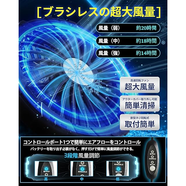 【高性能ブラシレスモータ搭載 強力送風】新型ブラシレスモータを採用し、運行が安定し、ブラシレス高速モータは7000r/minの回転速度に達することができる。従来のエアコンよりファンモーターの回転数が2倍以上になり、風量が大きくなり、さらに静かになります。高性能なモーターは、圧倒的な省エネ性能を持ち、従来よりも省エネ効菓が高く、暑い季節や高温環境でも長時間快適に動作し、最大出力で14時間の運転時間を維持し、一日中楽に仕事ができる、通常型エアコンファンより平均8度の体表温度を下げる効菓を実現している。暑い夏に、屋外作業などエアコンが使えない環境で働く人たちのための暑さ対策グッズです。作業効率を高め、高温の環境でも涼しく、快適に作業できます。
